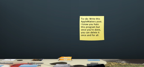 There's also the issue of "notes", which are similar to Stickies except you can pin them on the desktop or your virtual "walls". This could be a neat spin on to-do lists, but the thing is that the rear wall and bottom 10% of your desktop are completely offscreen. Not to mention the section hidden by the dock. This intro video uses an example of writing a gift list for your wife's anniversary on a note and hiding it from her by pinning it on the rear wall, but if you forget it's there, then it's virtually useless. And if you accidentally throw a file down to that netherworld of the bottom 10%, BumpTop gives you no hint that it's there. You've got to make a point of looking for it.
